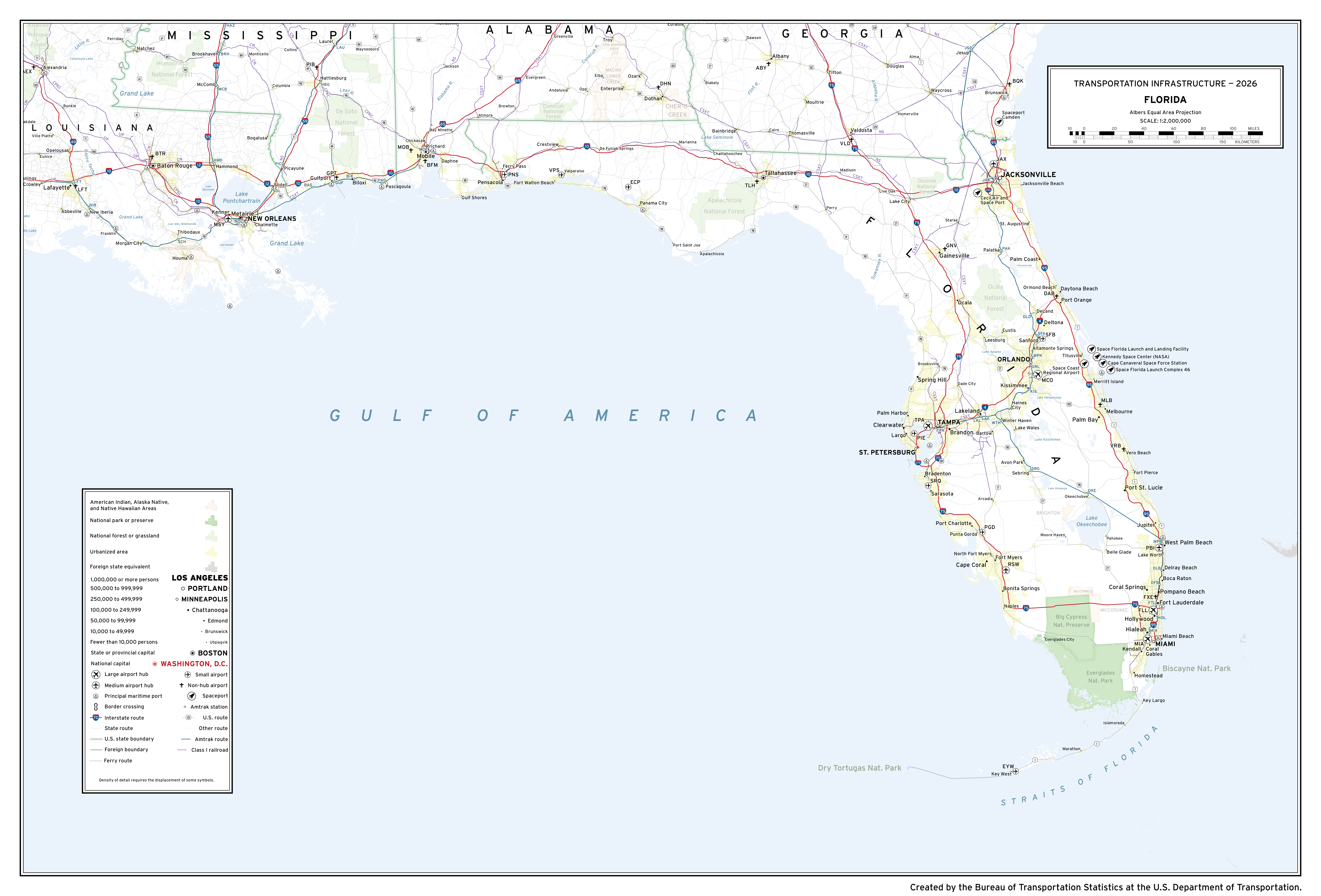 A 1:2 million scale map depicting major transportation infrastructure in the U.S. state of Florida. Aviation, roadway, rail, space, and water infrastructure are shown in addition to populated places and areas of interest. This is one of 20 maps from the National Transportation Atlas of the United States of America created by BTS.