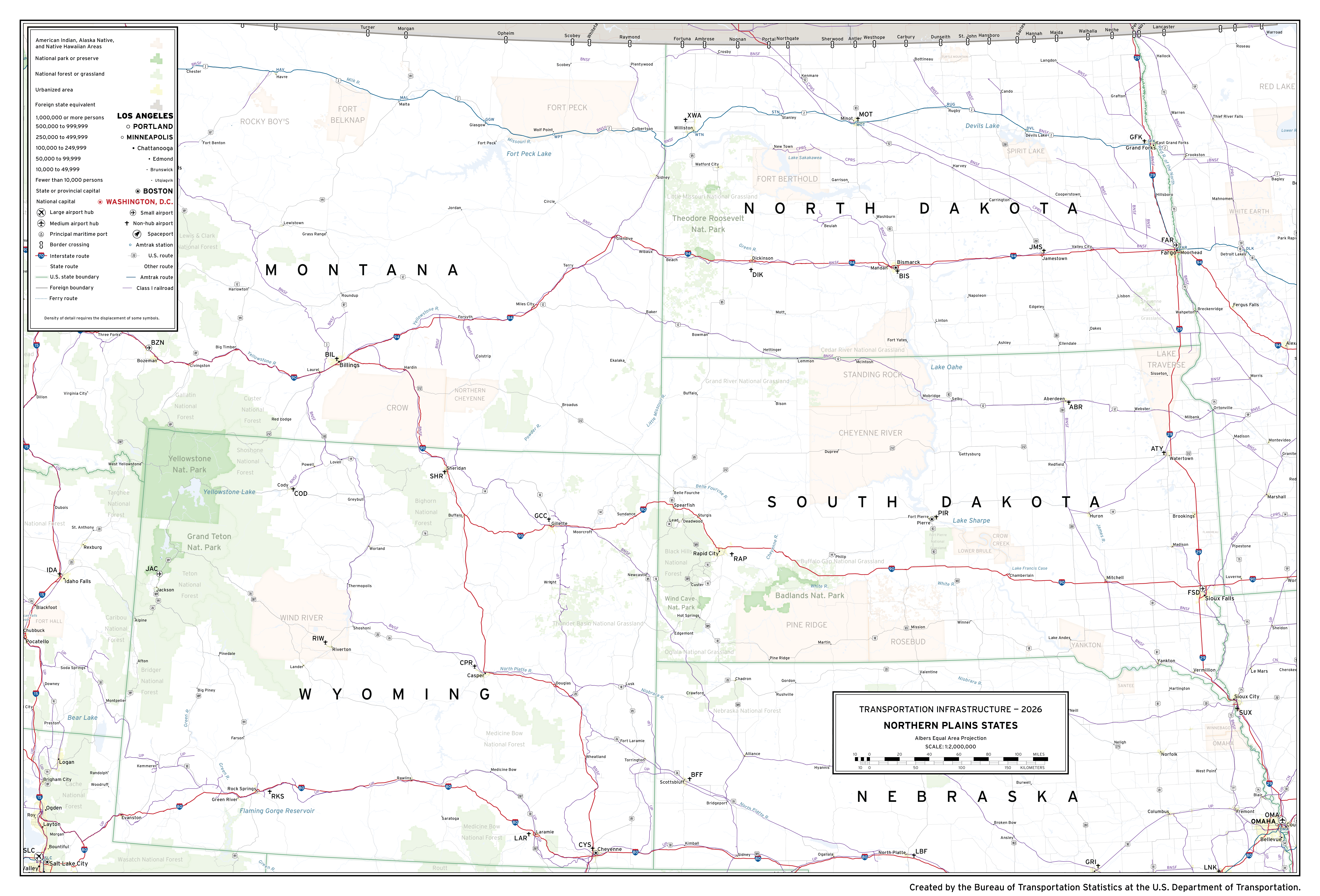 A 1:2 million scale map depicting major transportation infrastructure in the Northern Plains states of the United States comprising the states of MT, ND, SD, NE, and WY. Aviation, roadway, rail, space, and water infrastructure are shown in addition to populated places and areas of interest. This is one of 20 maps from the National Transportation Atlas of the United States of America created by BTS.