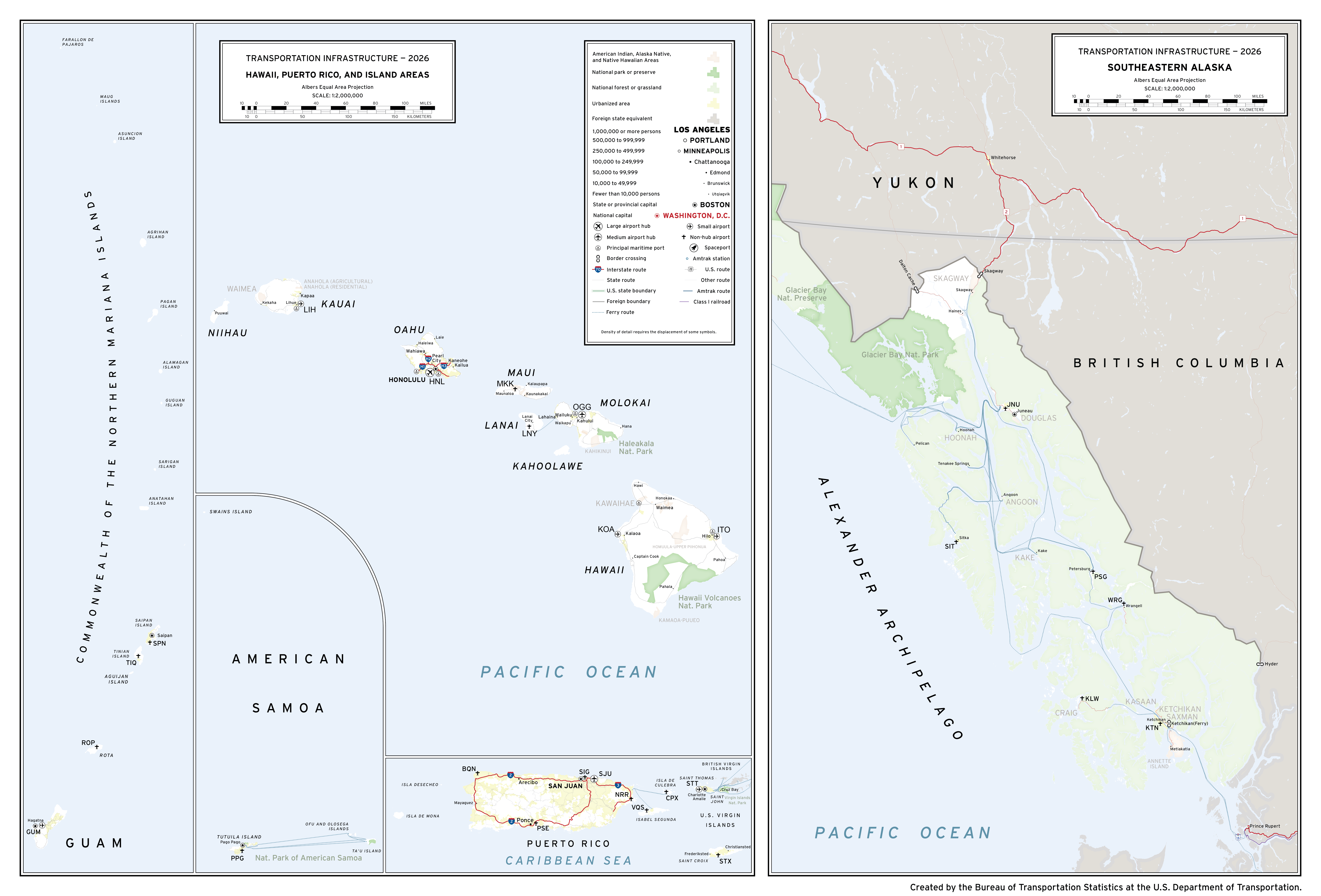 A 1:2 million scale map depicting major transportation infrastructure in southeastern part of the U.S. state of Alaska, in addition to the state of Hawaii and the territories of Puerto Rico, U.S. Virgin Islands, Guam, American Samoa, and the Commonwealth of the Northern Mariana Islands. Aviation, roadway, rail, space, and water infrastructure are shown in addition to populated places and areas of interest. This is one of 20 maps from the National Transportation Atlas of the United States of America created by BTS.