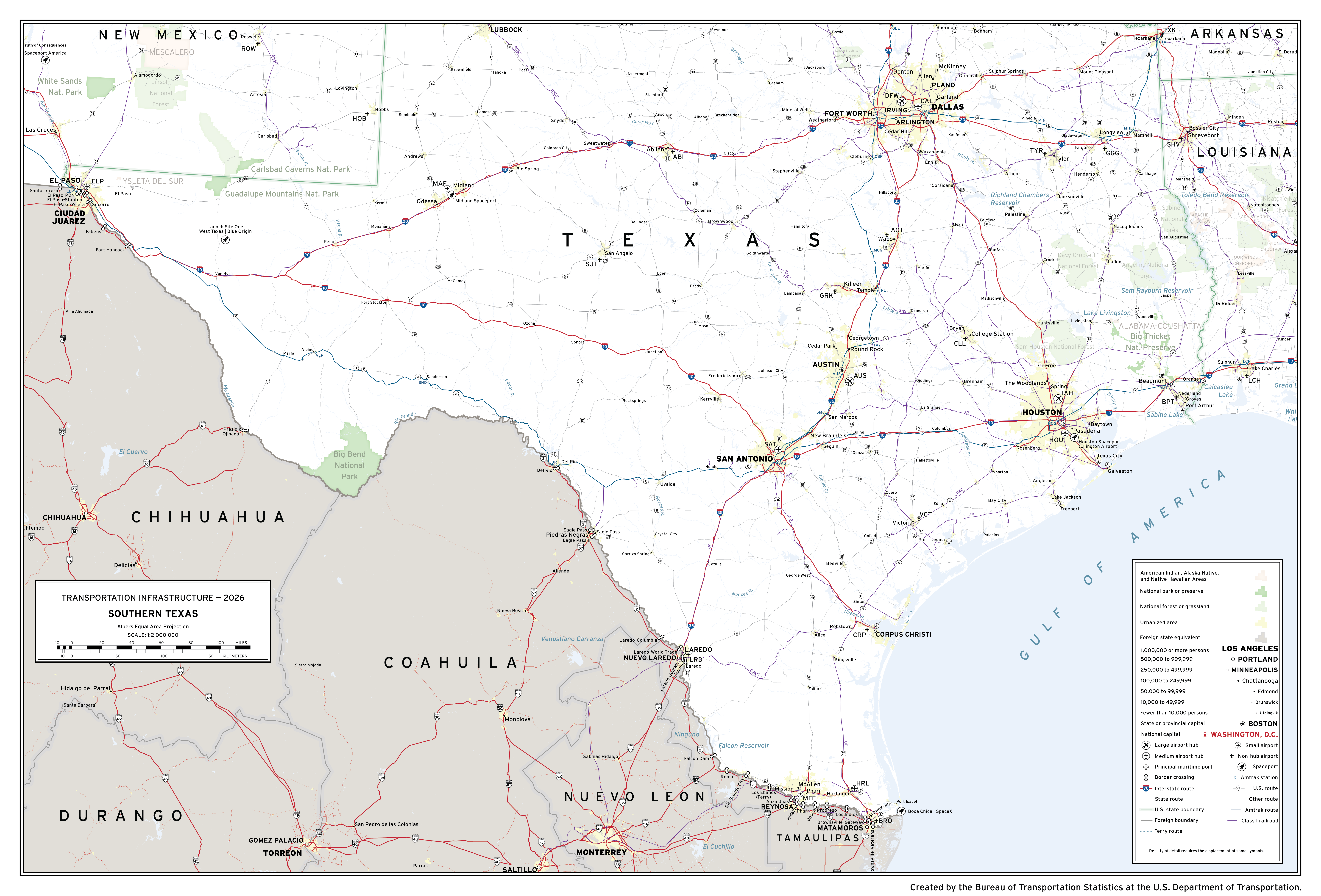A 1:2 million scale map depicting major transportation infrastructure in the southern portion of the U.S. state of Texas. Aviation, roadway, rail, space, and water infrastructure are shown in addition to populated places and areas of interest. This is one of 20 maps from the National Transportation Atlas of the United States of America created by BTS.