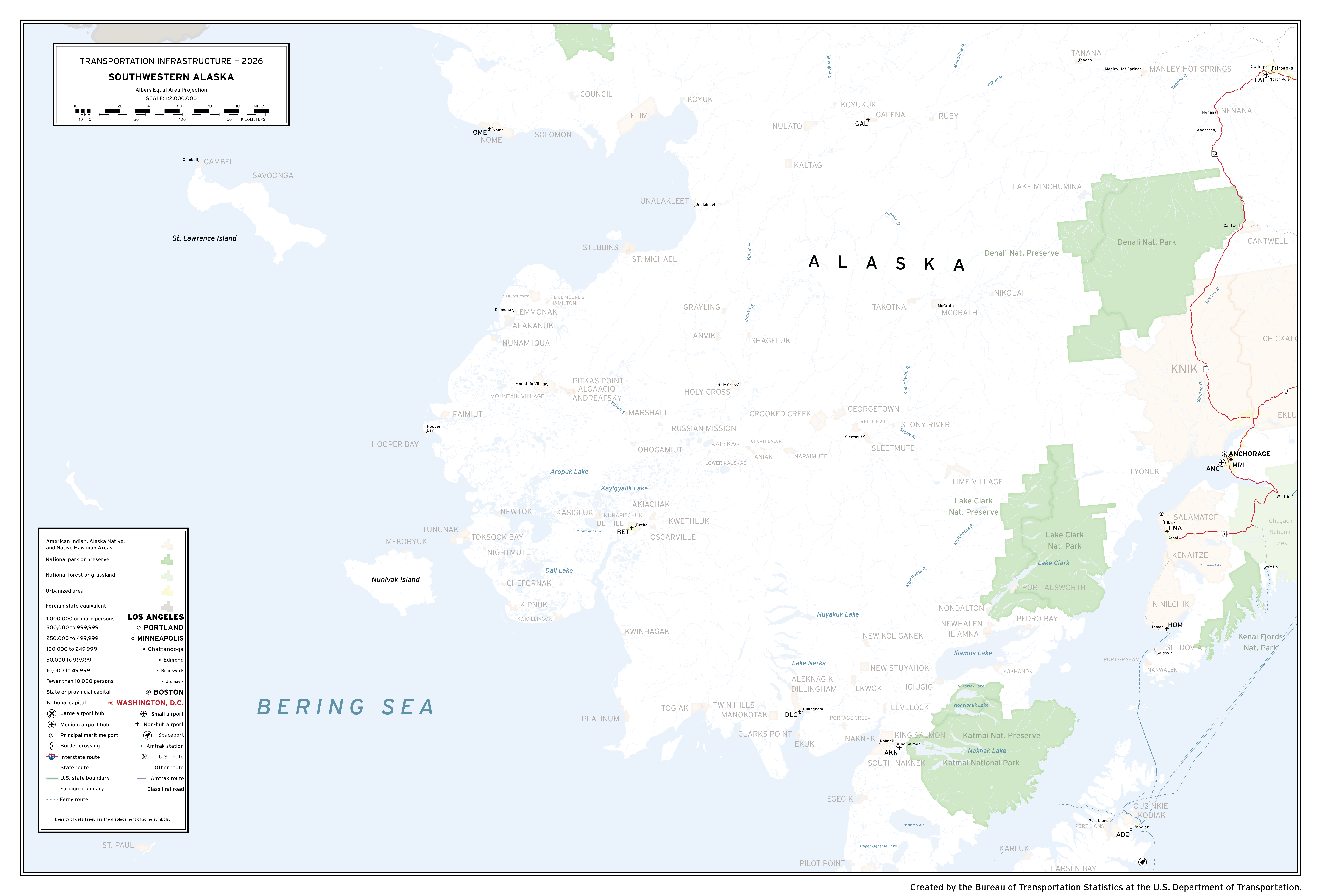 A 1:2 million scale map depicting major transportation infrastructure in the southwestern portion of the U.S. state of Alaska. Aviation, roadway, rail, space, and water infrastructure are shown in addition to populated places and areas of interest. This is one of 20 maps from the National Transportation Atlas of the United States of America created by BTS.