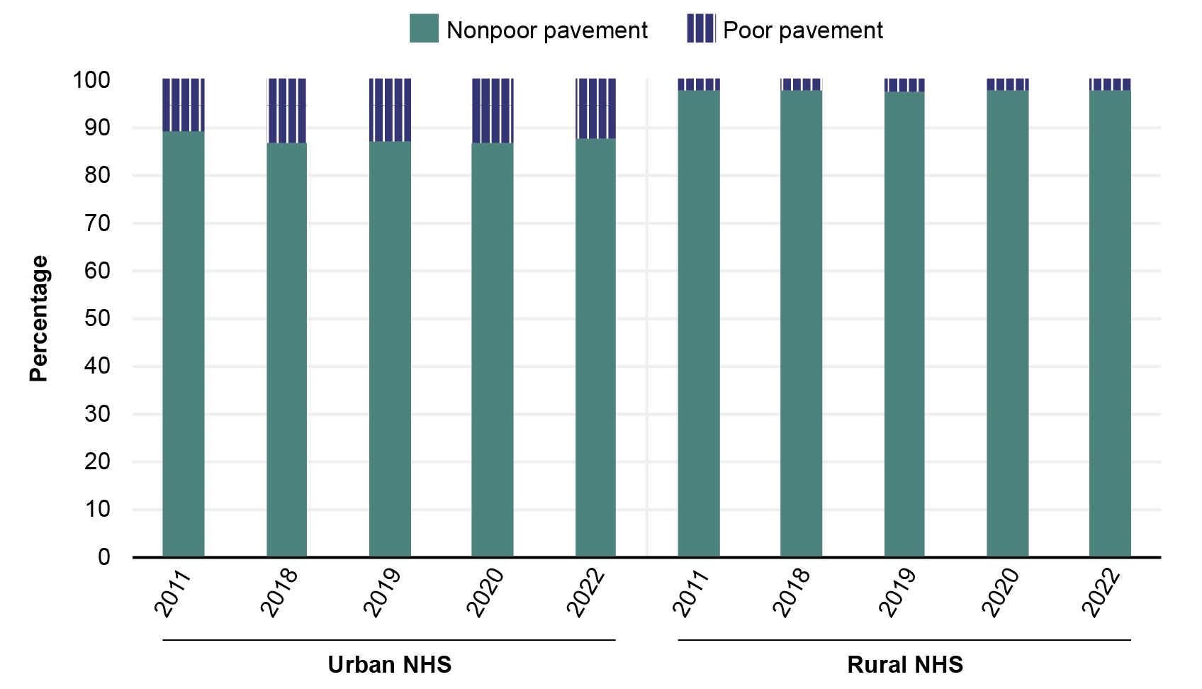U.S. Department of Transportation, Federal Highway Administration, National Highway System Length, Daily Travel by Measured Pavement Roughness – Urban and Rural. table HM-47A, available at www.fhwa.dot.gov/policyinformation/statistics/2022 as of August 2024.
