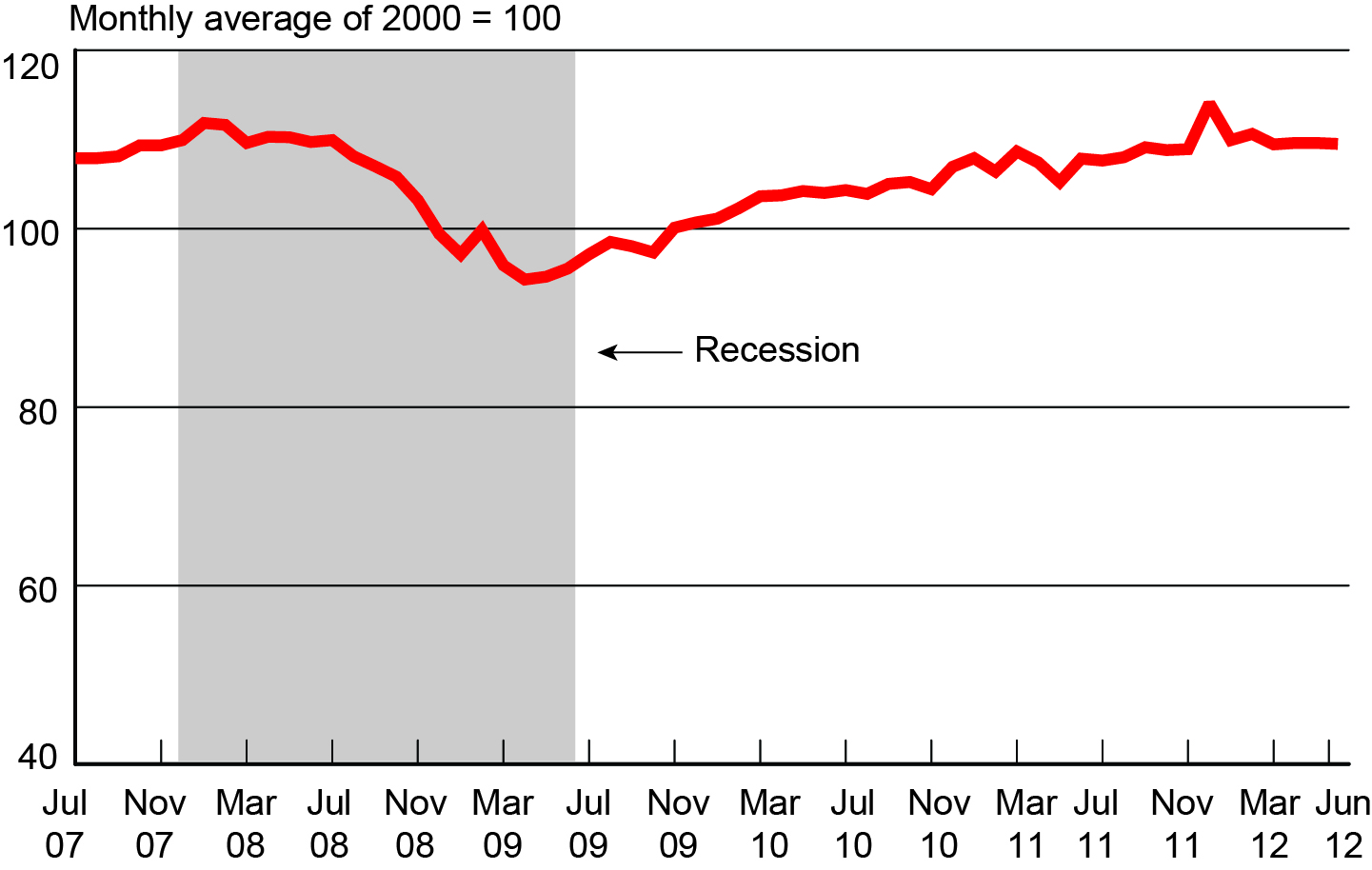 Same month of previous year: June 2012 freight shipments rose 1.6 percent from June 2011 and 14.6 percent from June 2009, during the recession, but remain below the level in June 2006 (111.9) prior to the recession (Tables 4, 5).
