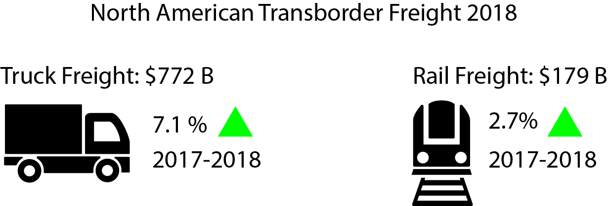 Total Transborder Freight: $1.2 trillion of transborder freight moved by all modes of transportation, up 7.8 percent from 2017.