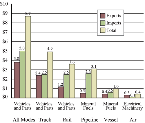 Trucks carried 67.4 percent of U.S.-NAFTA freight and continued to be the most heavily utilized mode for moving goods to and from both U.S.-NAFTA partners. Trucks accounted for $29.3 billion of the $45.0 billion of imports (65.1 percent) and $27.3 billion of the $39.0 billion of exports (70.0 percent) (Table 2).