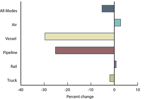 Mineral fuels are a large share of freight carried by vessel, which was down 9.4 percent year-over-year, and pipeline, down 46.5 percent (Figure 2, Table 3). The tonnage of mineral fuels imported by vessel increased 15.8 percent, somewhat offsetting the large price decline of the commodity.