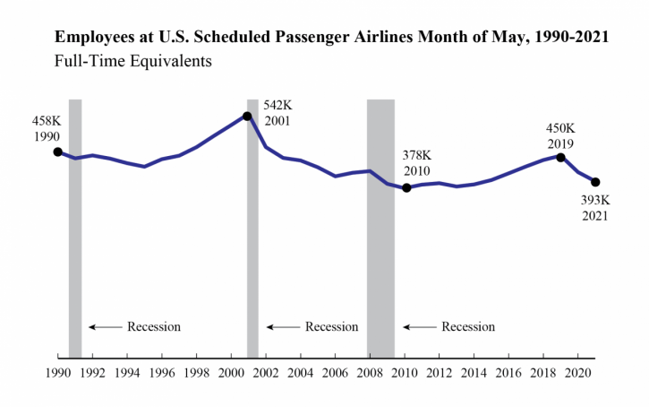 Data are compiled from monthly reports filed with BTS by commercial air carriers as of July 13. Additional airline employment data and previous releases can be found on the BTS website. BTS has scheduled release of June 2021 passenger airline employment data for Aug. 16.