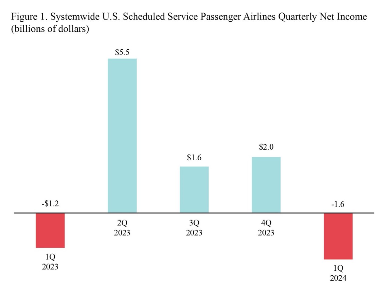 U.S. scheduled passenger airlines reported a first-quarter 2024 after-tax net loss of $1.6 billion and a pre-tax operating loss of $290 million.